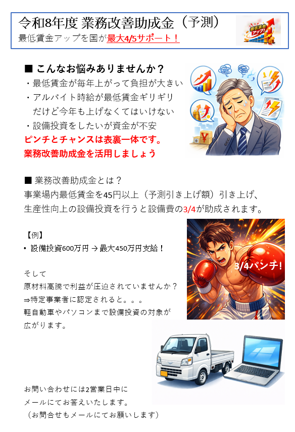 業務改善助成金を獲得しましょう!! 2026年2月23日 最終更新日時 : 2026年2月23日 SHIRO 経営者の皆様 業務改善助成金がリニューアルされる予定です。来年度の助成金獲得に今から行動をしましょう!!※生成AIでたくさんイラストを作成してチラシを作ってみました~っ。お問合せお待ちしています。 \ 最新情報をチェック / FacebookXBlueskyHatenaCopy